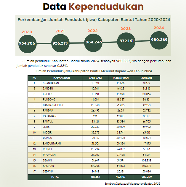 Kabupaten Bantul dengan luas wilayah 506,85 km2 terbagi menjadi 17 kapanewon, 75 kalurahan, dan 933 padukuhan. Pada tahun 2024 jumlah penduduk Kabupaten Bantul sebanyak 980.269 jiwa dengan rincian 488.162 jiwa laki-laki dan 492.107 jiwa perempuan. Jumlah penduduk terbanyak berada di Kapanewon Banguntapan dan jumlah penduduk terkecil berada di Kapanewon Kretek.