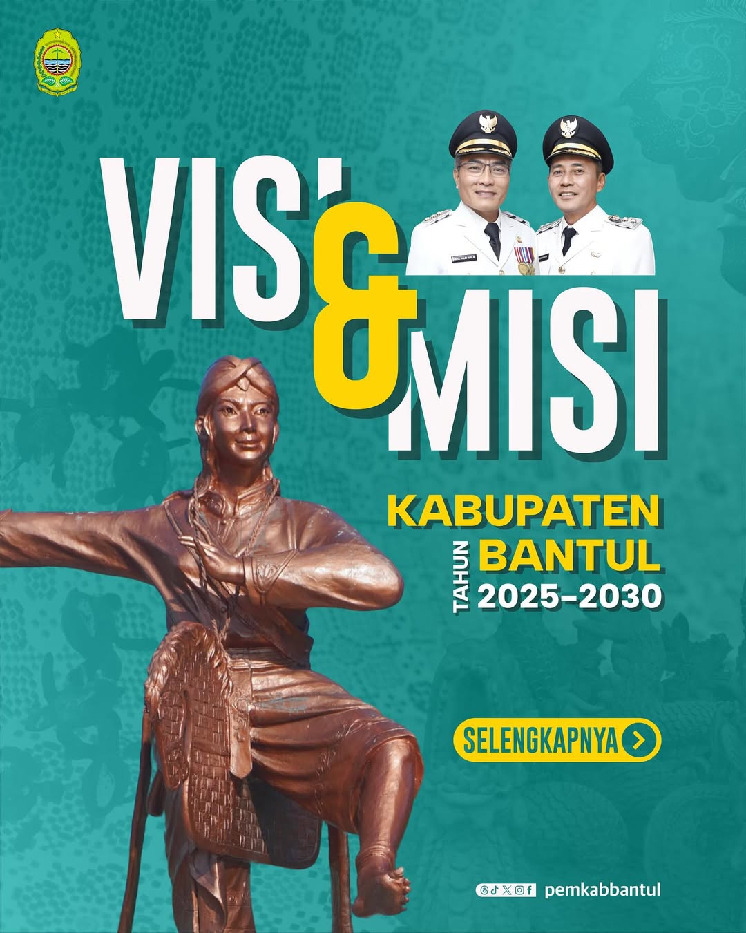 Terwujudnya Kabupaten Bantul yang maju, kuat, demokratis dan sejahtera dalam bingkai keberagamaan dan budaya istimewa.